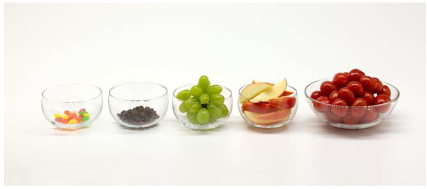 Hình 1. Lựa chọn thực phẩm có đậm độ năng lượng (ED – Energy Density), cùng một mức năng lượng là 100 kcalo, kẹo dẻo ăn được một lượng rất ít là 25gr (ED 4.0 calories per gram), nho khô ăn được một lượng là 33gr (ED 3.1 calories per gram), nho xanh ăn được một lượng là 145gr (ED 0.69 calories per gram), táo ăn được một lượng là 189gr (ED 0.53 per gram) và cà chua bi ăn được 555gr (ED 0.18 calories per gram).